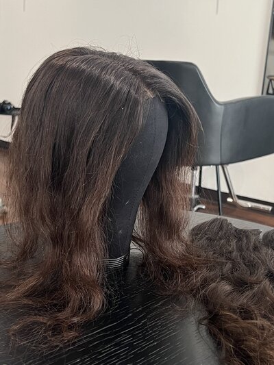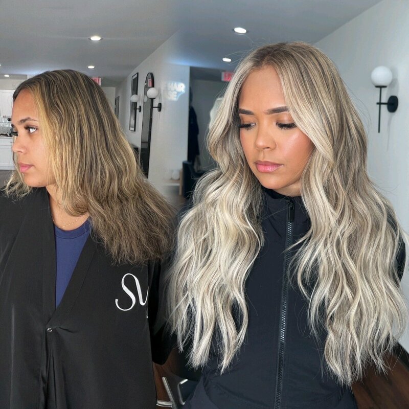 Private, design-led transformations using custom handmade keratin bonds, custom seamless weft extensions, and custom toppers for crown coverage.